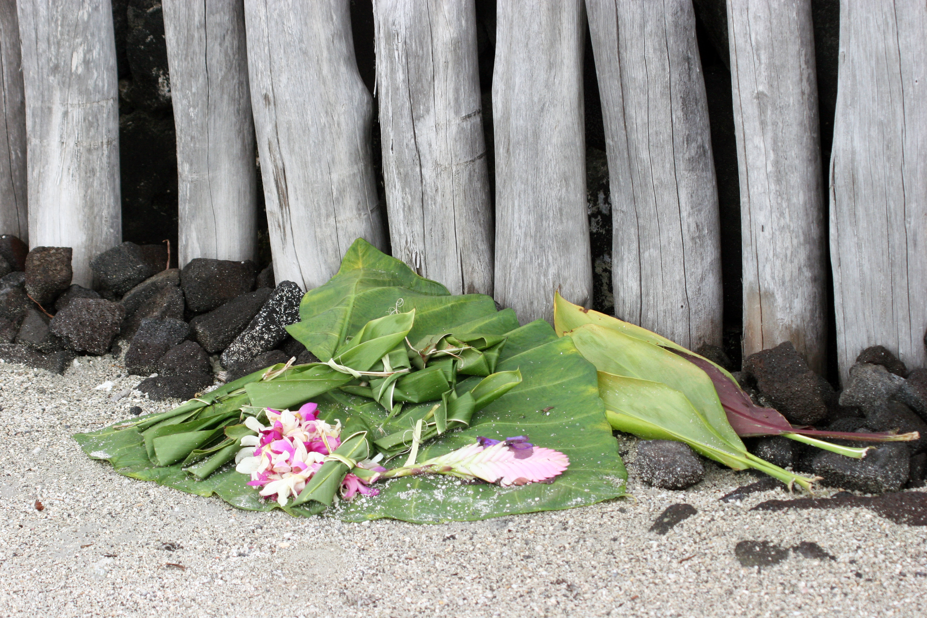 March 28, 2013 offering at the Place of Refuge Posted by KDKH an offering of flowers on large leaves as well as Ti leaves left at the Place of Refuge, Hawaii