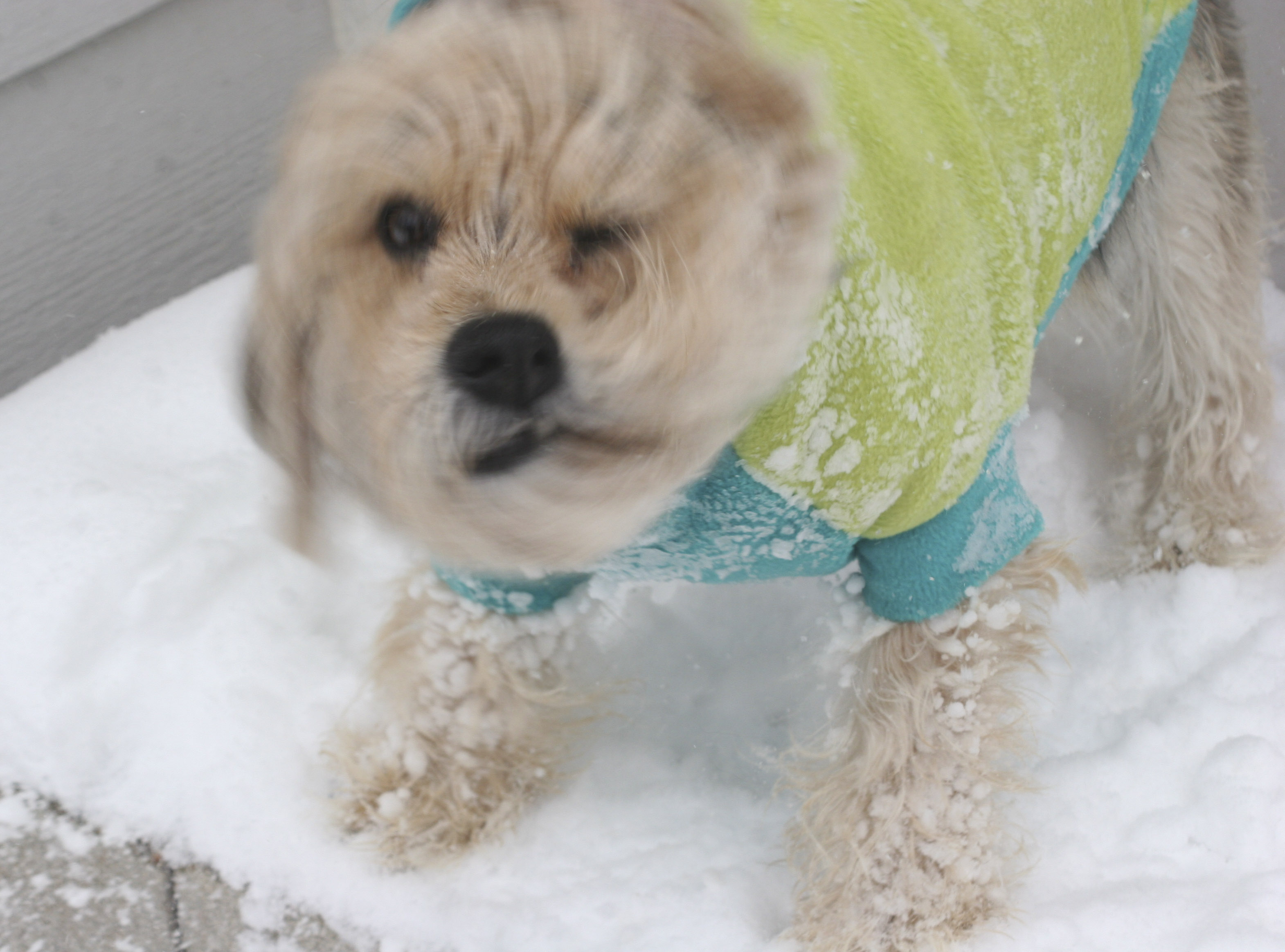 April 28, 2013 Tribble the Schnauffen Peagle in snow Posted by KDKH blonde dog in a green coat shakes off snow