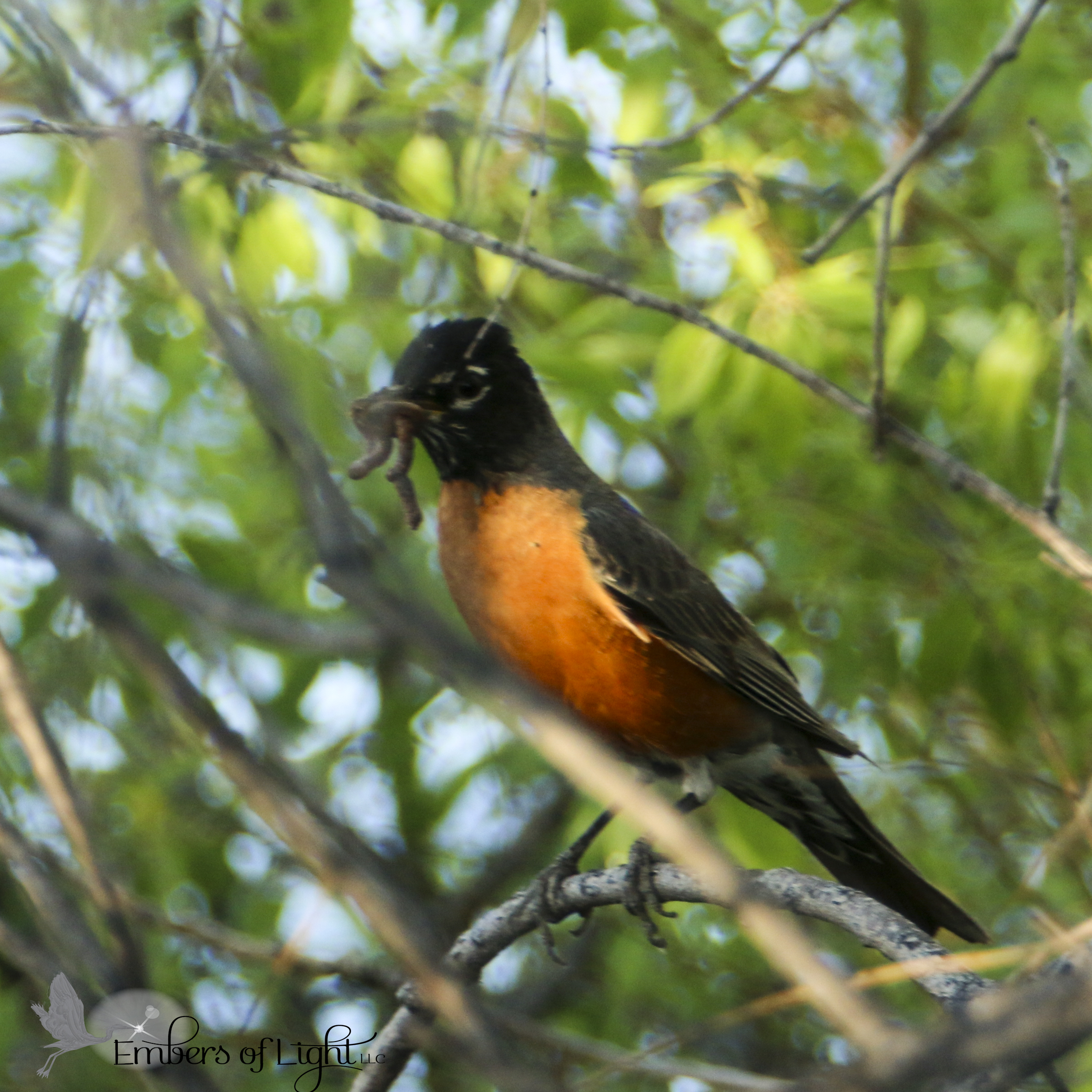 August 4, 2014 Robin with worm Posted by KDKH A robin with a bright orange chest sitts in a green tree, dangling a worm in its beak.