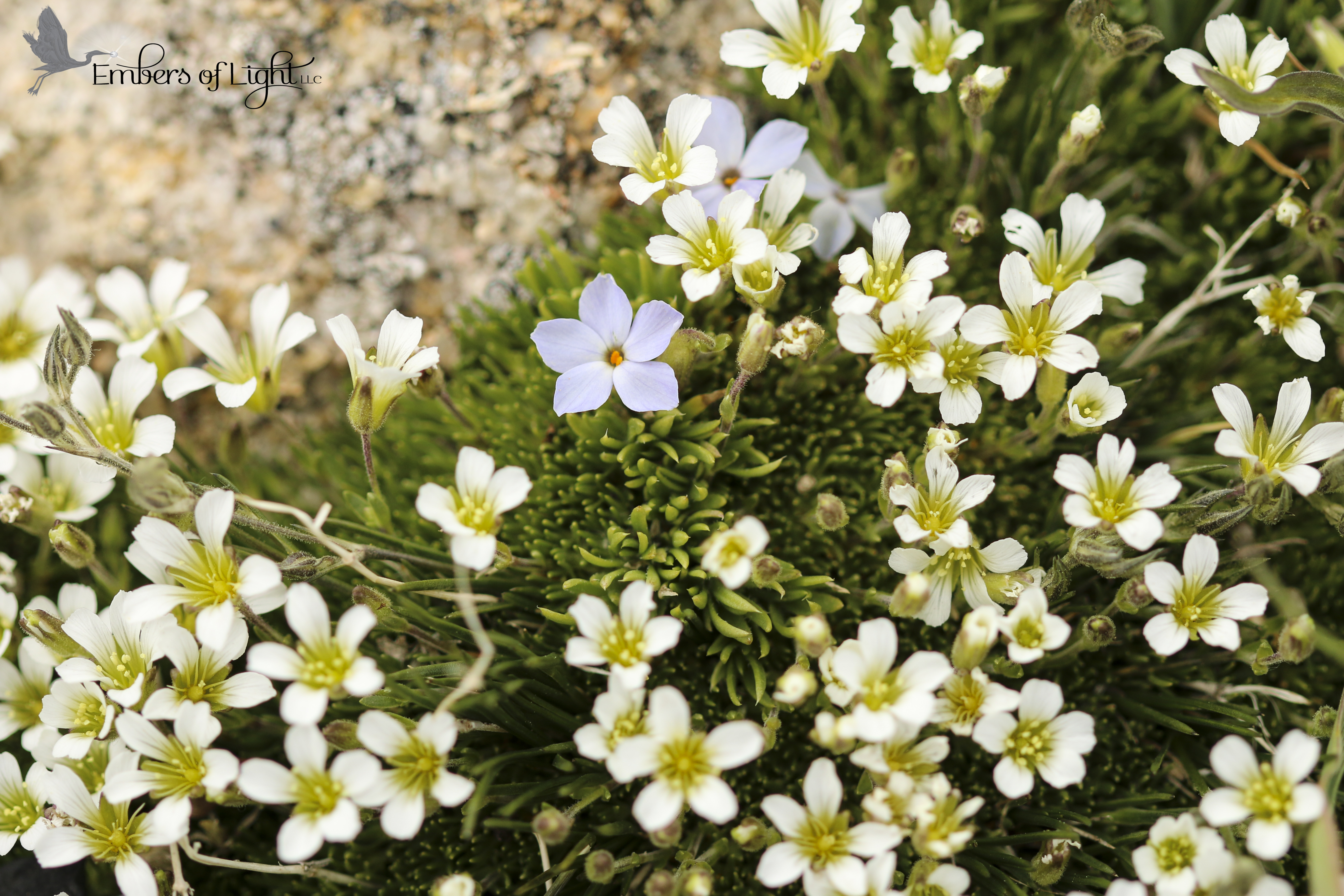 August 20, 2014 Alpine flowers white and lavender Posted by KDKH Tiny white/pale yellow blossoms grow beside a rock. Two tiny lavender blossoms spring up .