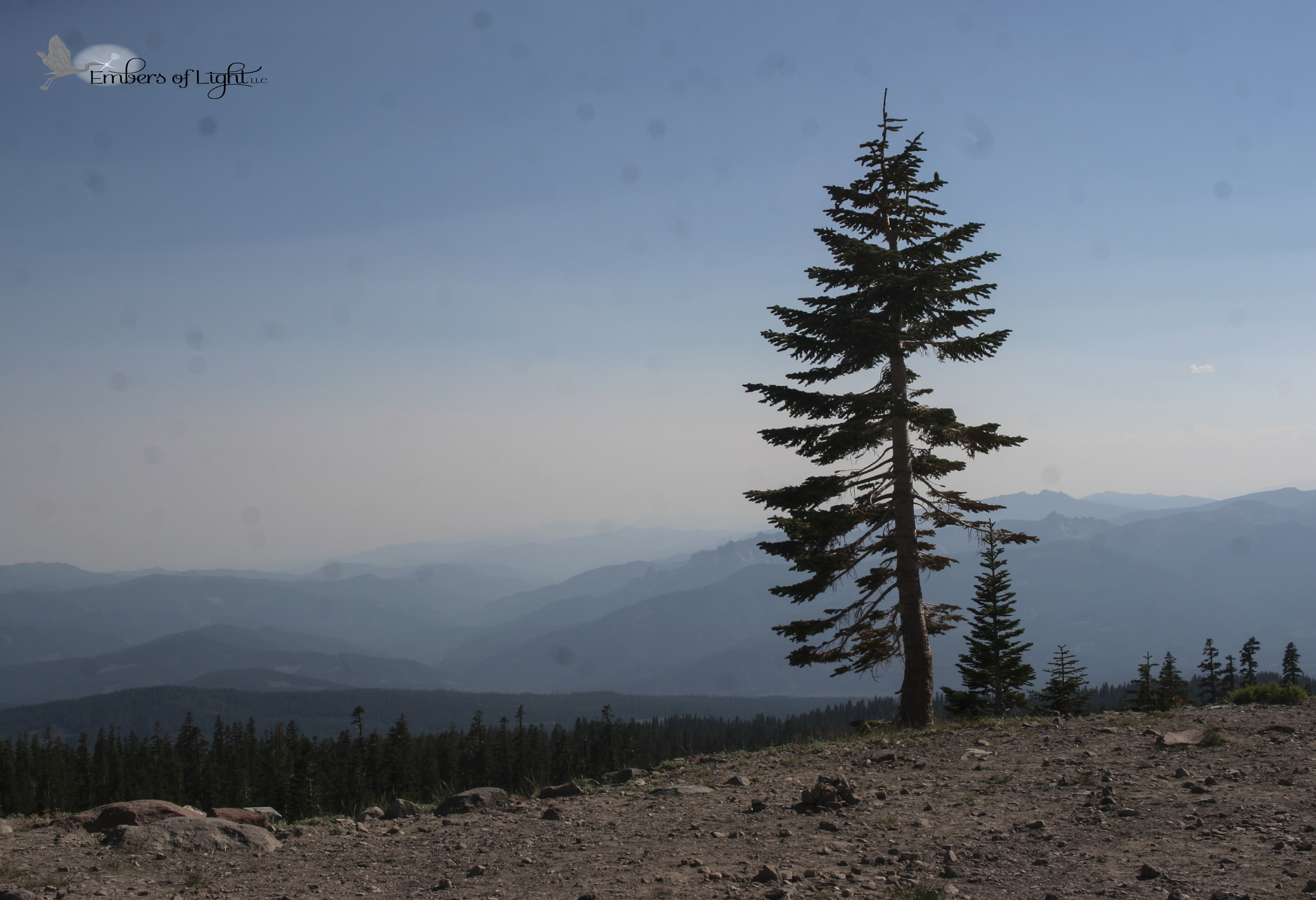 December 10, 2014 Pine at overlook Posted by KDKH A tall pine and a small sapling stand at the brink of an overlook. Misty hills are seen in the distance.