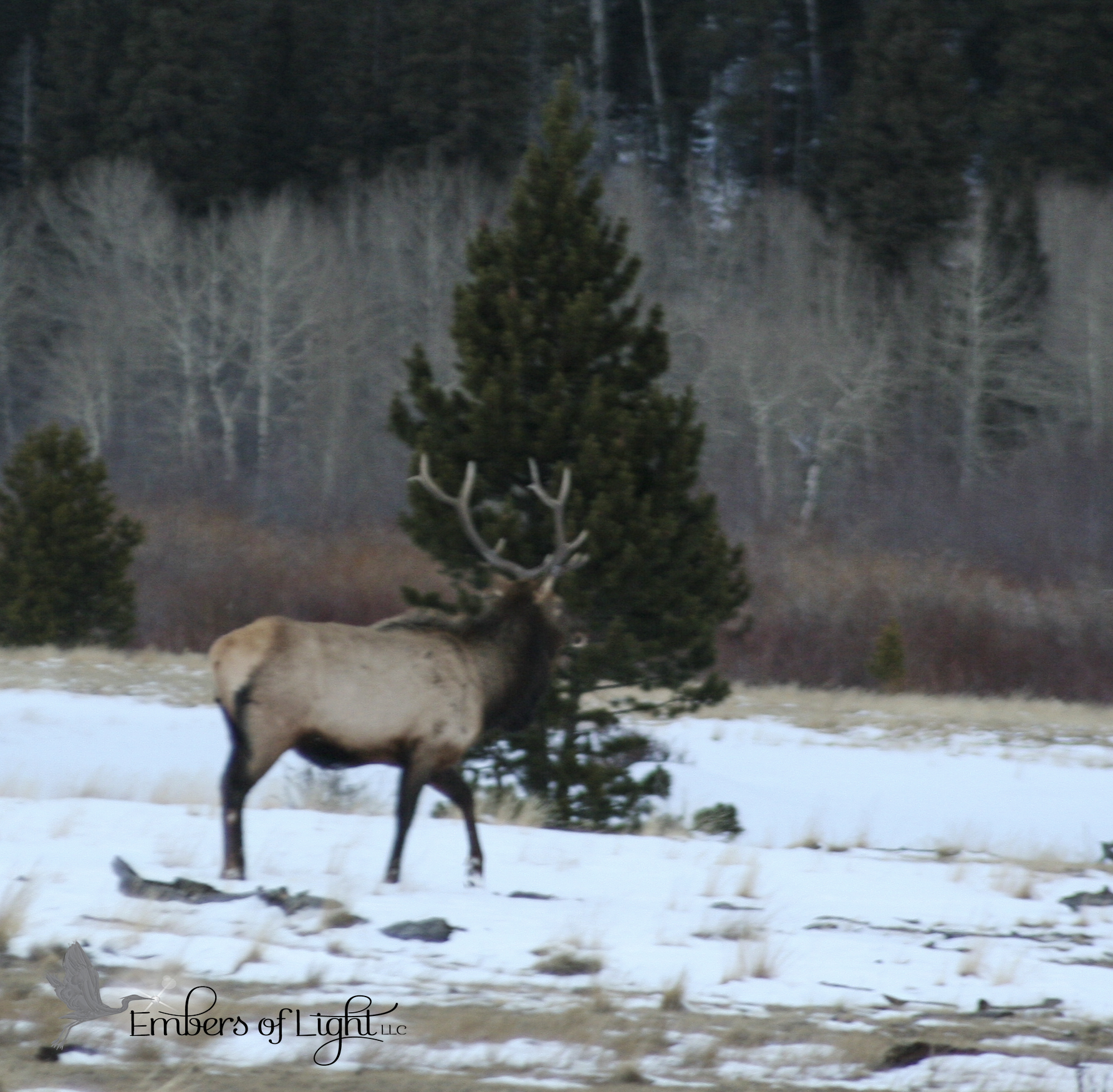March 9, 2015 Adult male elk Posted by KDKH A bull elk stand in shallow snow in front of an evergreen tree and aspens.